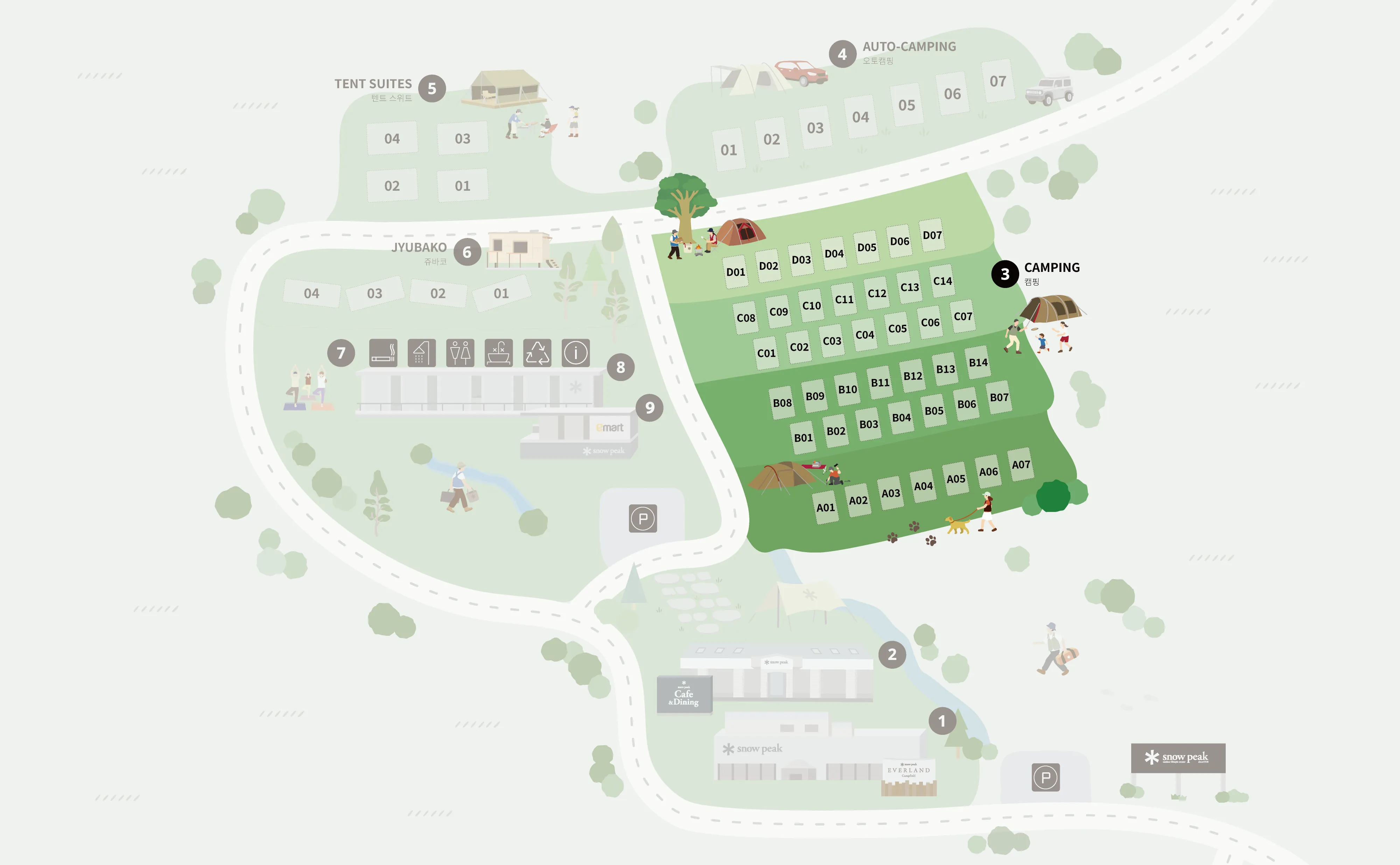 • 신규 유저에게는 스노우피크 텐트 및 장비를 풀옵션으로 사용할 수 있는 ‘텐트 스위트’ 예약을 추천드립니다.